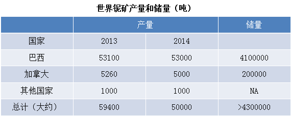 根據美國地質調查局2014年發(fā)布的數(shù)據,全球鈮資源儲量超過430萬噸,并且分布相對集中,僅巴西一國鈮資源儲量就占到了全球總儲量的95%左右。