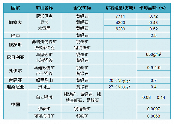 根據美國地質調查局2014年發(fā)布數(shù)據,巴西的鈮礦資源儲量居世界首位,約為410萬噸,其次是加拿大,約為20萬噸。此外,澳大利亞、中國、埃塞俄比亞、尼日利亞、俄羅斯、美國、剛果(金)、肯尼亞等國也有分布。